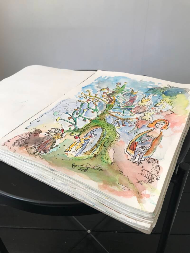 We kozen ervoor het schetsboek in zijn geheel te exposeren. Ga er rustig voor zitten en laat je meevoeren in een wereld die zich pagina na pagina ontvouwt.