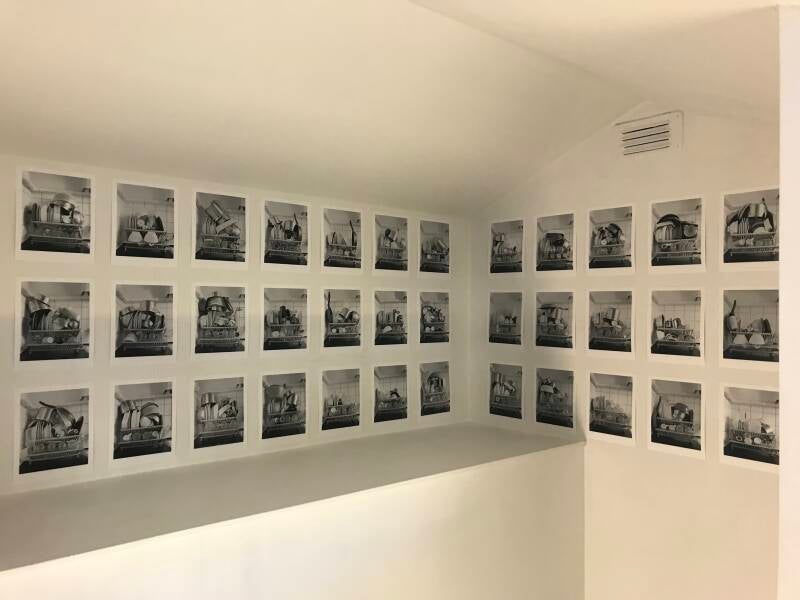 Als de afwas toch eens af was! Sinds jaar en dag doet autonoom fotograaf Nico Bick zijn vaat met de hand, van afdrogen houdt hij niet. Op zijn afdruiprek creëert hij van serviezen en keukenspullen vernuftige stapelwerken. Deze bouwwerken legt hij vast met zijn analoge camera – een 4x5 inch technische camera, voor wie het weten wil. Elke grote afwas wordt zo gedocumenteerd, al sinds maart 2020. Zijn expositie in Tiny Showroom bestaat dan ook uit maar liefst 137 (!) beelden die op het oog identiek lijken maar allemaal anders zijn. En dat maakt van een gewoon huishoudelijk werkje iets heel spannends om naar te kijken: afwas om van te genieten. ‘Grundformen’, noemt hij de indrukwekkende serie zwart-wit beelden.
