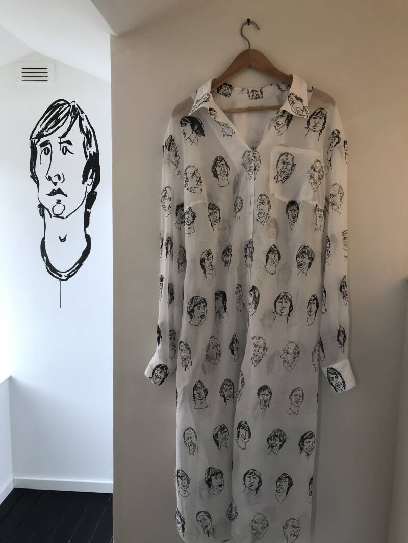 Eliane Gerrits tekent al haar hele leven. Ze maakt vrij werk en werk in opdracht zoals kinderboeken en illustraties voor tijdschriften waaronder Elsevier. Recent tekende ze een serie portretten van Johan Cruijff, door zijn leven heen - jong en oud. Die tekeningen liet Eliane ook op stof drukken en daar maakte Piffin Duvekot een jurk van. En zo ontstond de Cruijffjurk die ook op de expositie te zien is.